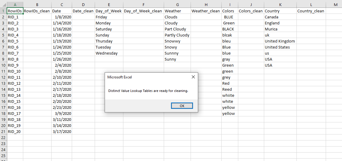 Once you click or run the appropriate macro, the macro will process the entire worksheet putting each column on a new worksheet with an adjacent column labeled after the original with an extension “_clean”. Every column is processed.